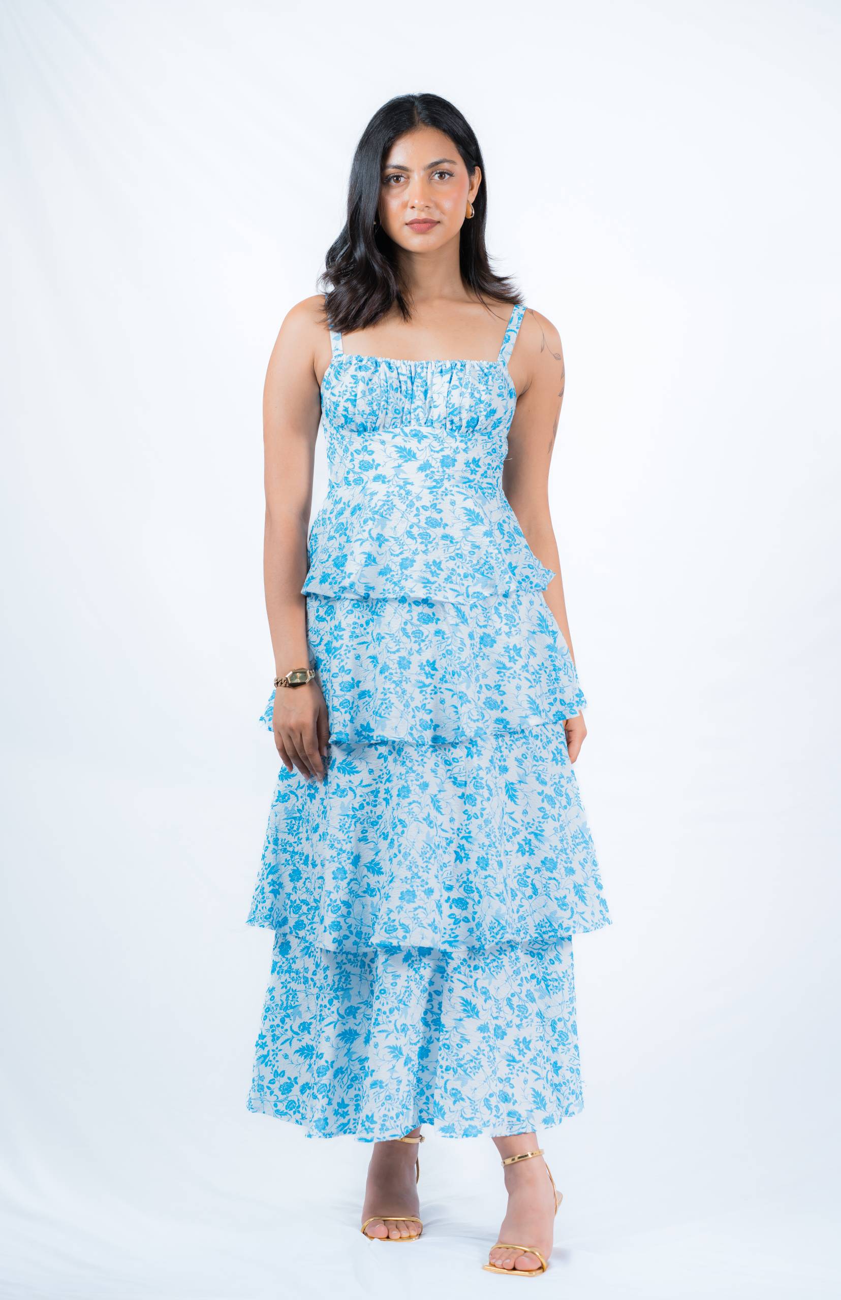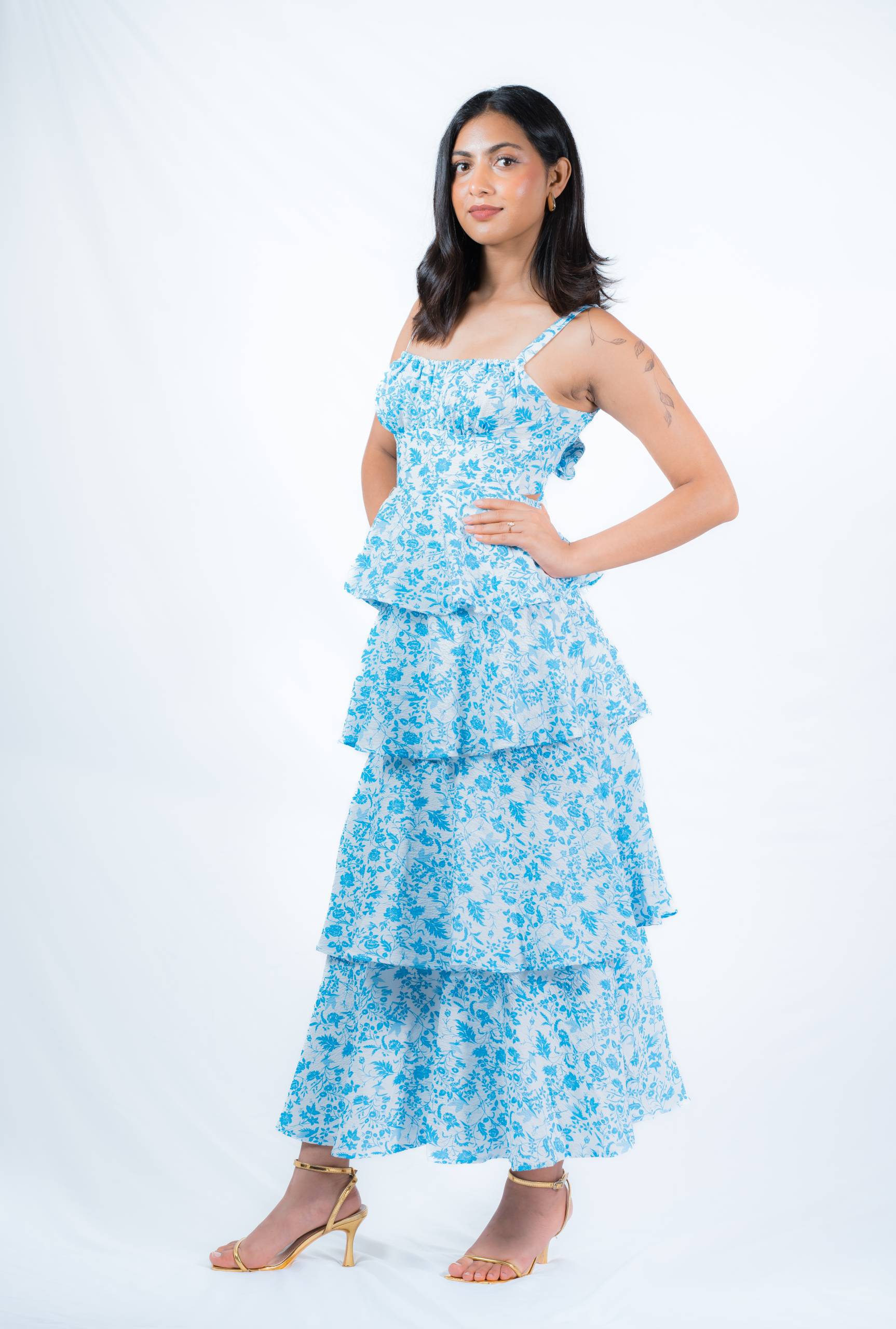 A dreamy blue floral dress featuring layered ruffles and a flattering tie-back design.