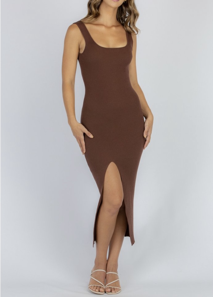 A chic brown rib-knit dress that hugs your silhouette with soft, stretchy comfort. Perfect for cozy sophistication.